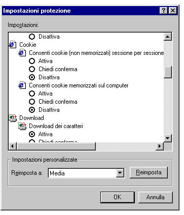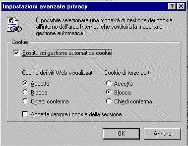 Dalla lista della voce "Cookie dei siti web visualizzati" selezioanre la voce "Accetta" deselezionare la voce "Sostituisci gestione automatica cookie" per rendere le voci sottostanti non modificabili premere il tasto "OK". Per chiudere la schermata "Opzioni internet" premere il tasto "OK" | ||