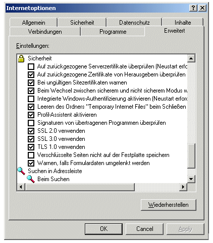 | Wählen Sie aus der Liste das Stichwort "Sicherheit" und klicken auf "SSL 3.0 verwenden" wenn nicht bereits eingestellt. Drücken Sie die Schaltfläche "OK". | ||