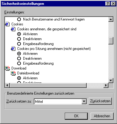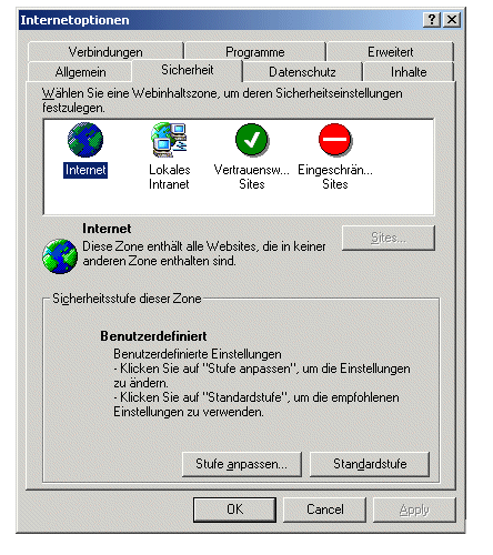 (2) beim Stichwort "Cookies annehmen, die gespeichert sind", wählen Sie das Stichwort "Aktivieren" (3) beim Stichwort "Cookies pro Sitzung annehmen (nicht gespeichert)", wählen Sie das Stichwort "Aktivieren" (4) drücken sie die Schaltfläche "OK" (5) haben Sie nun die vorgenannten Stichworte geändert, wird eine Mitteilung eingeblendet, drücken Sie „JA". Wählen Sie das Stichwort " Lokales Intranet " und wiederholen Sie die vorher unter den Punkten 1) bis 5) aufgelistete Prozedur. Schließen Sie die Bildschirmseite " Internetoptionen" durch Drücken der Schaltfläche "OK". | ||