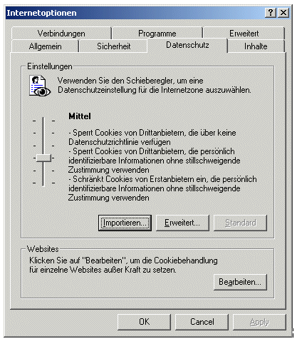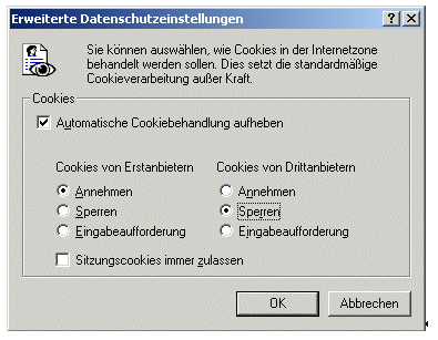 Aus der Liste des Stichworts "Cookies von Erstanbietern" wählen Sie "Annehmen". Entfernen Sie nun das Häkchen im Ankreuzfeld beim Stichwort " Automatische Cookiebehandlung aufheben" zur Deaktivierung der untenstehenden Stichworte. Drücken Sie die Schaltfläche "OK". Schließen Sie die Bildschirmseite " Internetoptionen" durch Drücken der Schaltfläche "OK". | ||