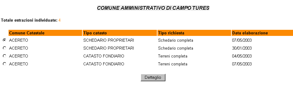 ![]() Selezionando una voce della lista e premendo il tasto "dettaglio" č possibile scaricare i dati inerenti la richiesta selezionata. VEDI ANCHE:- scarico richiesta - tipologia di archivi |