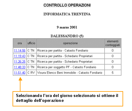 Effettuando un click sull'ipertesto contenuto nella colonna ORA verrà visualizzato il dettaglio dell'operazione corrispondente. VEDI ANCHE: