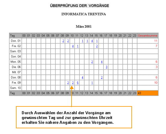 ausgewählten Zeitraum Nachdem Sie den gewünschten Zeitraum für die Erstellung der Statistiken über die durchgeführten Vorgänge ausgewählt haben, wird folgende Maske eingeblendet, in der die Anzahl der nach Tag und Uhrzeit (mit stundenweiser Erfassung) geordneten Vorgänge enthalten íst. |