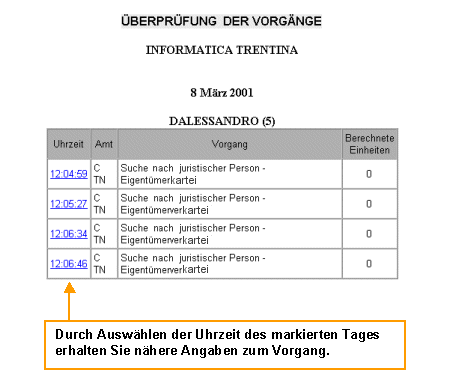 ![]() Durch Klicken auf den in der Spalte "Uhrzeit" enthaltenen Hypertext wird die Angabe zum entsprechenden Vorgang eingeblendet. SIEHE AUCH: