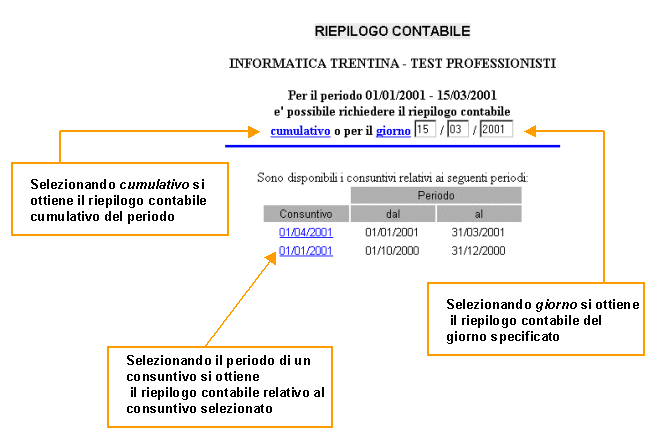 Alla scelta Riepilogo contabile viene visualizzata la pagina riportata in figura. E' possibile richiedere il riepilogo contabile cumulativo oppure relativo ad un giorno specificato, cliccando ripettivamente sugli ipertesti cumulativo oppure giorno. Viene inoltre prodotta la lista dei consuntivi già prodotti dal sistema: essi sono disponibili per la consultazione, e l'utente può richiederne la visualizzazione cliccando sull'ipertesto della data del consuntivo di interesse. | ||||