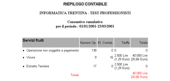 Alla scelta Riepilogo contabile cumulativo viene visualizzata la pagina riportata in figura. Relativamente al periodo selezionato nella schermata precedente viene visualizzato l'elenco dei servizi fruiti dall'utente, e per ogni servizio vengono indicati il numero di operazioni effettatre, gli elementi contabilizzati, la tariffa applicata ed il totale. | ||||
