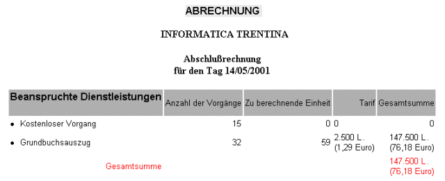 | Abrechnung für den Tag Wenn Sie "Abrechnung für den Tag" wählen, wird die hier abgebildete Seite eingeblendet, auf der das Verzeichnis aller beanspruchten Dienstleistungen des in der vorigen Maske angegebenen Tages angezeigt wird. Für jede Dienstleistung werden die Anzahl der vorgenommenen Vorgänge, die zu berechnenden Einheiten, der angewandte Tarif und die Gesamtsumme angegeben.