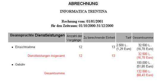| Abschlußrechnung Wenn Sie "Abschlußrechnung" wählen, wird die hier abgebildete Seite eingeblendet, auf der das Verzeichnis aller beanspruchten Dienstleistungen der in der vorigen Maske angegebenen Abschlußrechnung angezeigt wird. Für jede Dienstleistung werden die Anzahl der vorgenommenen Vorgänge, die zu berechnenden Einheiten, der angewandte Tarif und die Gesamtsumme angegeben. |