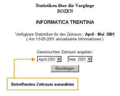 angeben Wenn Sie "Statistiken über die Vorgänge" wählen, wird die hier abgebildete Seite eingeblendet. Mittels der Pulldown-Menüs im Kästchen können Sie einen bestimmten Zeitraum auswählen. Stimmt dieser Zeitraum mit einem einzelnen Monat überein, ist es notwendig, dass der betreffende Monat in beiden Kästchen aufscheint (z.B. Februar 1999: im Kätschen Nr. 1 = Februar 1999 und im Kästchen Nr.2 = Februar 1999). Um die durchgeführten, nach erbrachter Dienstleistung unterteilten Vorgänge anzuzeigen, drücken Sie nach Einstellung des gewünschten Zeitraums auf die Schaltfläche "Bestätigen". |