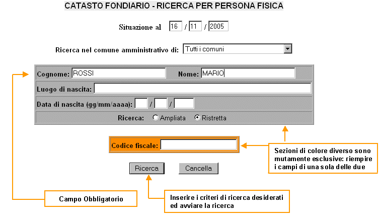 ricerca per anagrafica della persona fisica e l'ambito geografico (provincia o comune amministrativo) in cui effettuare la ricerca. |
