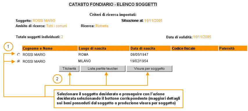 A seguito della Ricerca per persona fisica si ottiene una lista di soggetti rispondenti ai criteri impostati. Su questa lista occorre selezionare un solo elemento di cui si vogliono vedere i dati ed il tipo di operazione che si vuole eseguire su di esso. |