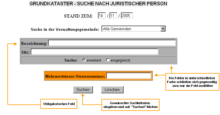 Aus der HOMEPAGE wählen Sie "Grundkataster - Suche nach juristischer Person" aus und klicken Sie dann auf die Schaltfläche ok. Es wird eine Maske eingeblendet, in der Sie die Suchkriterien nach den Angaben zur juristischen Person einstellen können. |
