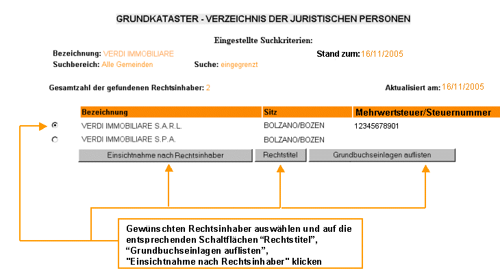 | Verzeichnis der juristischen Personen Infolge der "Suche nach juristischer Person" erhalten Sie ein Verzeichnis der juristischen Personen, die den eingestellten Suchkriterien entsprechen. Aus diesem Verzeichnis wählen Sie eine einzelne juristische Person, in deren Daten Sie Einsicht nehmen wollen, sowie den gewünschten Vorgang aus. |