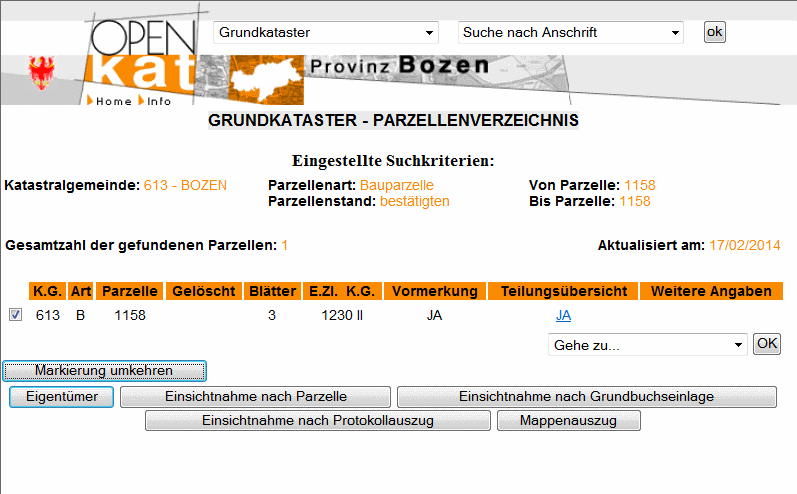 gefundenen Liegenschaftsverzeichnisse aufgelistet. Sie können eine Liegenschaft sowie den