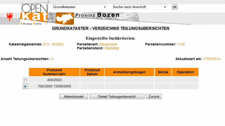 Vom Parzellenverzeichnis kann, indem man den Link “Ja” in der Kolonne “Teilingsübersicht” auswählt, das entsprechende Verzeichnis der Teilungsübersichten der bestimmten Parzelle geöffnet werden. |