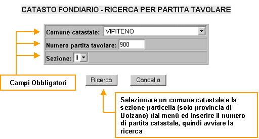 Dalla HOME PAGE selezionare Catasto Fondiario, la voce Ricerca per partita tavolare e cliccare sul bottone ok. Verrą visualizzata la maschera per impostare i criteri di ricerca per identificativo dalla partita tavolare. |