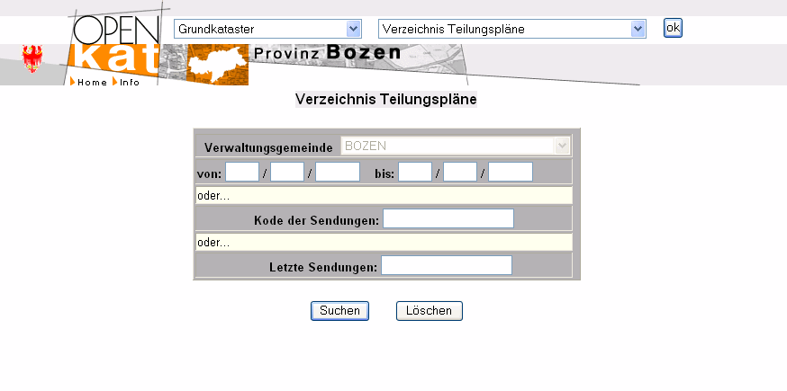 Um zu dieser Funktion Zugriff zu haben, wählen Sie „Grundkataster” und „Verzeichnis Teilungspläne“ aus den diesbezüglichen Leisten und klicken Sie dann auf die Schaltfläche „ok“. Es wird eine Maske eingeblendet in der die Sendungen der Teilungspläne nur für diese Verwaltungsgemeinde gefiltert werden können. Deshalb kann der Wert für das Suchkriterium “Verwaltungsgemeinde” nicht geändert werden. |