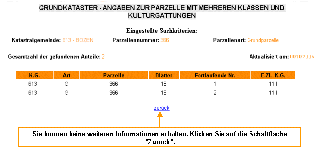 Diese Maske ermöglicht keine weiteren Abfragen. Um zurückzukehren, klicken Sie auf die Schaltfläche "Zurück" bzw. auf "back". |