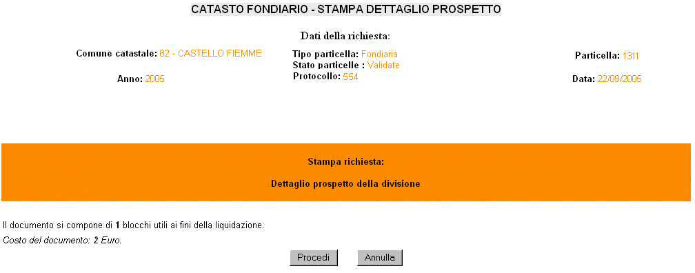Prima di visualizzare il documento effettivo relativo alla stampa richiesta, il servizio ripresenta un riassunto dei dati richiesti e, quindi, riporta il numero blocchi di cui si compone il documento così reperito. A questo punto l'utente può decidere se proseguire, e quindi pagare la transazione, o se terminare l'operazione. Un esempio di quest'ultima pagina viene riportata nella figura seguente: |