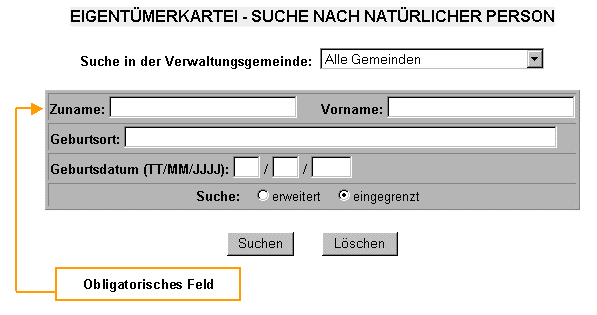Provinz Aus der HOMEPAGE wählen Sie "Grundbuch - Suche nach natürlicher Person - Eigentümerkartei" aus und klicken Sie auf die Schaltfläche ok. Es wird eine Maske eingeblendet, in der Sie die Suchkriterien nach Personalien der natürlichen Person einstellen können. |