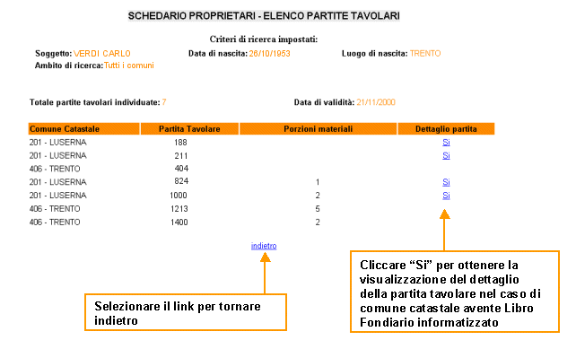 Per sapere quali sono le partite tavolari possedute da un soggetto si proceda come segue: 1. eseguire una ricerca o per persona fisica o per persona giuridica; 2. dall'elenco dei soggetti ottenuto dalla ricerca selezionare il soggetto di cui si vuole sapere la lista delle partite tavolari . Cliccare, quindi, sul bottone Lista partite tavolari che si trova in fondo all'elenco. A questo punto viene visualizzato Lista partite tavolari possedute dal soggetto. La tabella i dati di ciascuna partita tavolare ritrovata e gli eventuali numeri di porzioni materiali. |