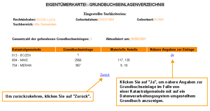 jenen auswählen, dessen Grundbuchseinlagen Sie auflisten wollen. Klicken Sie auf die