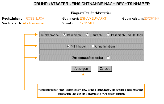| Einsichtnahme nach Rechtsinhaber In der "Einsichtnahme nach Rechtsinhaber" wird die Vermögenslage eines Rechtsinhabers angegeben. Die Einsichtnahme kann im Bereich der Provinz bzw. der Gemeinde angefordert werden. |