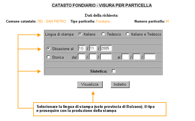 La Visura per particella riporta le informazioni relative ad una particella selezionata. Quando si richiede una Visura per particella, viene presentata la pagina di impostazione dei criteri di visura in cui l'utente può scegliere la lingua di stampa. La visura può essere richiesta alla data attuale o ad una particolare data (per un particolare intervallo di date la visura storica); in caso di richiesta diversa dalla data attuale si otterrà la situazione censuaria risultante a quella data. Se viene selezionata l'opzione "sintetica" per ogni intestato della particella vengono indicatati, se presenti negli archivi catastali, gli estremi del documento tavolare con il quale è stata acquisita la proprietà di ogni singola quota della particella. |