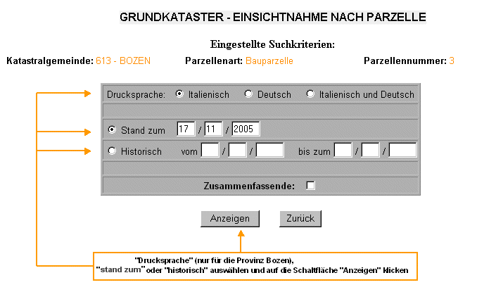 | Einsichtnahme nach Parzelle In der "Einsichtnahme nach Parzelle" werden die Angaben zur ausgewählten Parzelle angeführt. Wenn Sie die Einsichtnahme nach Parzelle anfordern, wird folgende Seite eingeblendet, in der Sie die Suchkriterien einstellen und die Drucksprache wählen können. |