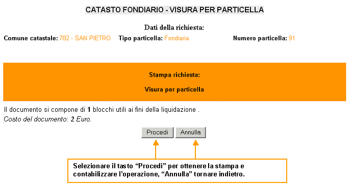 Prima di visualizzare il documento effettivo relativo alla visura richiesta, il servizio ripresenta un riassunto dei dati richiesti e, quindi, riporta il numero di blocchi di cui si compone il documento così reperito. A questo punto l'utente può decidere se proseguire, e quindi pagare la transazione, o se terminare l'operazione. Un esempio di quest'ultima pagina viene riportata nella figura seguente: |