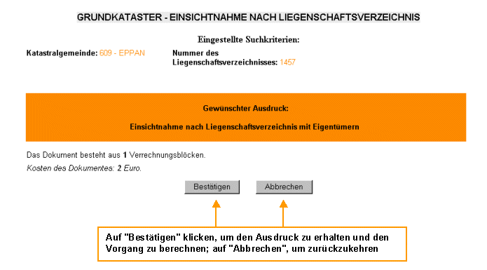 Bevor das Dokument mit der gewünschten Einsichtnahme angezeigt wird, wird die Übersicht über die verlangten Daten sowie die Anzahl der Blöcken, aus denen sich das gefundene Dokument zusammensetzt, eingeblendet. Nun können Sie entscheiden, ob Sie den Vorgang bestätigen und infolgedessen bezahlen oder diesen abbrechen wollen. Ein Beispiel dazu ist hier abgebildet: |