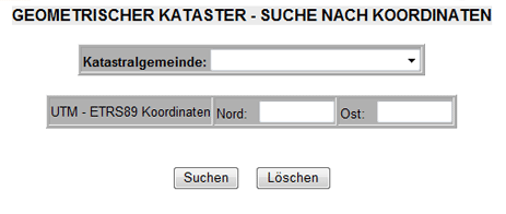 Suche nach Koordinaten Aus der HOMEPAGE wählen Sie Geometrischer Kataster - Suche nach Koordinaten aus und klicken Sie dann auf die Schaltfläche ok. Es wird eine Maske eingeblendet, in der Sie die Suchkriterien nach Koordinaten einstellen können. |