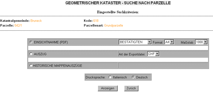 Mappenauszug In Folge einer Suche nach Parzelle wird die Bildschirmseite vorgestellt, die es ermöglicht die Parameter einzugeben, um eine Einsichtnahme im PDF-Format, einen Auszug im EOO- oder DXF-Format oder die historische Mappe zu erhalten. Im Falle der Einsichtnahme in die bestätigten Parzellen, kann das Dokument im A3- oder A4- Format, in den variablen Maßstäben von 1:1000 bis 1:5000, beantragt werden. Der Auszug (auf Datei) wird hingegen immer derart erstellt, dass die Daten einer Gebietsfläche von 180m x 200 m circa entsprechen. |