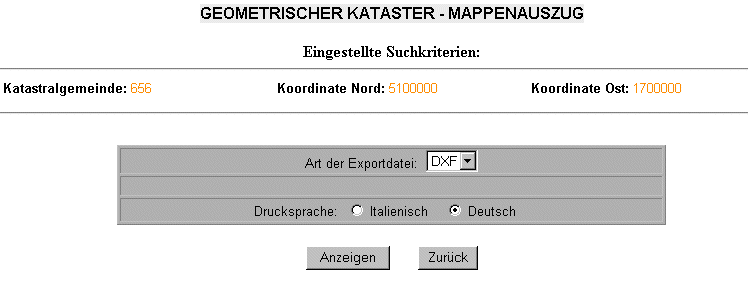 Mappenauszug nach Koordinaten In Folge einer Suche nach Koordinaten wird die Bildschirmseite vorgestellt, welche die Eingabe der Parameter ermöglicht, um einen Auszug im DXF- oder EOO-Format zu erhalten. Der Auszug, auf Datei, wird derart erstellt, dass die Daten einer Gebietsfläche von 180m x 200m entsprechen. |