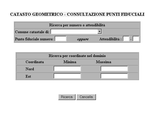 Consultazione punti fiduciali Dalla HOME PAGE selezionare Catasto Geometrico, la voce Consultazione punti fiduciali e cliccare sul bottone ok. Verrà visualizzata la maschera per impostare i criteri di ricerca dei punti fiduciali. La ricerca può essere effettuata per: - ricerca per punto fiduciale (comune