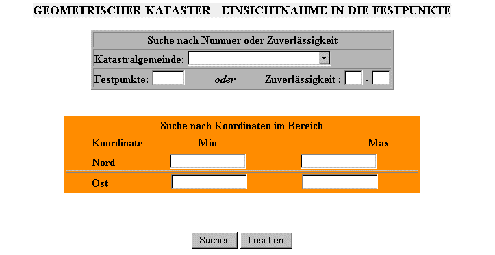 | Es wird eine Vorkontrolle auf den eingegebenen Zwischenraum der Koordinaten durchgeführt, welcher einer Fläche von höchstens 10 km² entsprechen kann. Im Falle, dass kein Festpunkt die eingestellten Suchkriterien erfüllt, wird eine Fehlermeldung eingeblendet. SIEHE AUCH:
