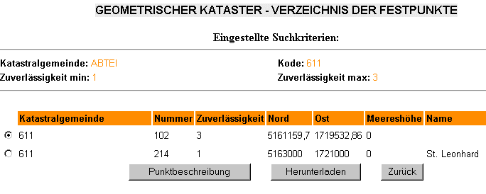 Verzeichnis der Festpunkte In Folge einer Suche, wird das Verzeichnis der Festpunkte eingeblendet, das die eingestellten Suchkriterien erfüllt. Für jeden Punkt werden folgende Informationen wiedergegeben: Katastralgemeinde und Nummer des Festpunktes, Koordinate Nord, Ost und Meereshöhe; Zuverlässigkeit und Beschreibung des Festpunktes. |