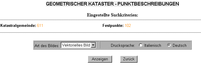 Abruf einer Punktbeschreibung In Folge der Auswahl eines Festpunktes wird die Bildschirmseite vorgestellt, die es ermöglicht die Parameter einzugeben um eine Punktbeschreibung im PDF-Format zu erhalten. Die Combo-Box „Art des Bildes" gibt die auf dem kartographischen System vorhandenen Bildarten für den spezifischen Festpunkt wieder und kann die Werte „Vektorielles Bild", „Raster-Bild", „Foto 1", „Foto 2", „Skizze", „Kein Bild" enthalten.. |