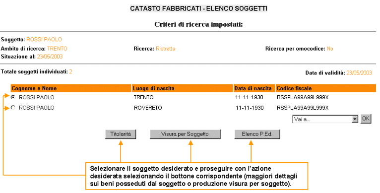 Lista delle Persone Fisiche A seguito della ricerca per persona fisica, si ottiene una lista dei soggetti per i criteri impostati. Su questa lista occorre selezionare un solo elemento di cui si vogliono vedere i dati ed il tipo di operazione che si vuole eseguire su di esso. |