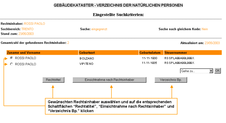 ![]() Wird in das Feld "Stand zum" auf der Suchmaske ein Datum eingegeben, das nicht mit dem vom System voreingestellten Datum (historische Suche ) übereinstimmt, so scheinen im Verzeichnis der gleichnamigen Rechtsinhaber nur jene Rechtsinhaber auf, die zum angegebenen Datum Inhaber von Liegenschaftseinheiten waren. Die Option "Rechtstitel" ist in diesem Fall nicht verfügbar. SIEHE AUCH: