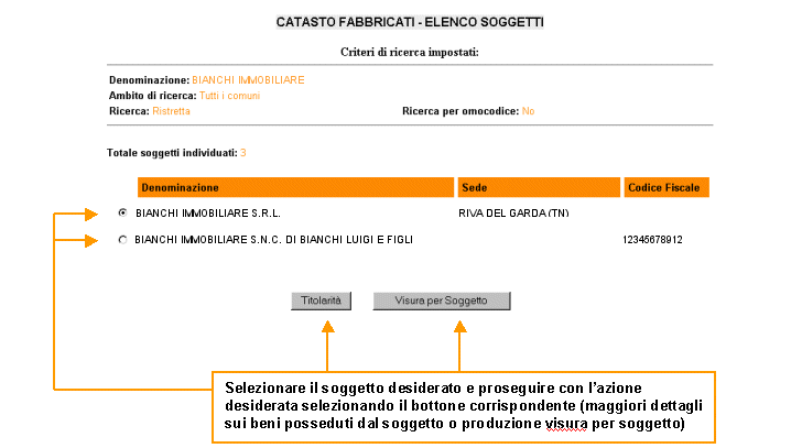 Nel caso in cui sia stata specificata nella videata di ricerca una data "situazione al" diversa da quella preimpostata dal sistema (ricerca storica ), la lista di omonimi riguarderà solo i soggetti titolari di unità immobiliari alla data specificata, e non sarà disponibile il pulsante Titolarità. |
