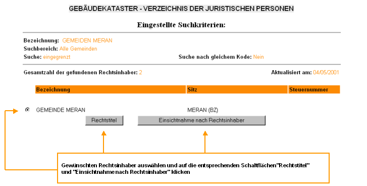Wird in das Feld „Stand zum" auf der Suchmaske ein Datum eingegeben, das nicht mit dem vom System voreingestellten Datum (historische Suche) übereinstimmt, so scheinen im Verzeichnis der gleichnamigen Rechtsinhaber nur jene Rechtsinhaber auf, die zum angegebenen Datum Inhaber von Liegenschaftseinheiten waren. Die Option "Rechtstitel" ist in diesem Fall nicht verfügbar. |