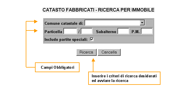 Dalla HOME PAGE selezionare Catasto Fabbricati, la voce Ricerca per Immobile e cliccare sul bottone ok. Verrà visualizzata la maschera per impostare i criteri di ricerca per immobile. |
