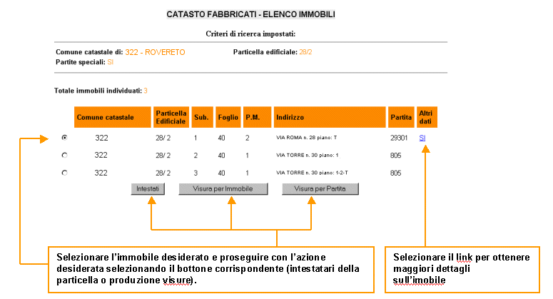 La pagina riporta l'elenco degli immobili reperiti dal sistema sulla base dei criteri di ricerca impostati. E' possibile selezionare un immobile e quindi la tipologia di funzione che si vuole eseguire sull'immobile selezionato (i bottoni in fondo alla pagina). |