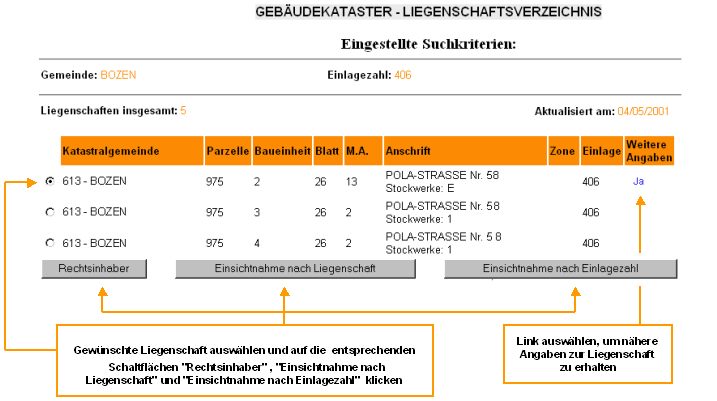 Sind weitere Angaben zur Liegenschaft vorhanden, wird das Wort JA in der Spalte "Weitere Angaben" eingeblendet. Um die weiteren Angaben zur Liegenschaft zu erhalten, klicken Sie auf das entsprechende Ja. SIEHE AUCH: |