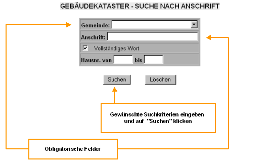 | Suche nach Anschrift Aus der HOMEPAGE wählen Sie "Gebäudekataster - Suche nach Anschrift" aus und klicken Sie dann auf die Schaltfläche ok. Es wird eine Maske eingeblendet, in der Sie die Suchkriterien nach Anschrift einstellen können. |