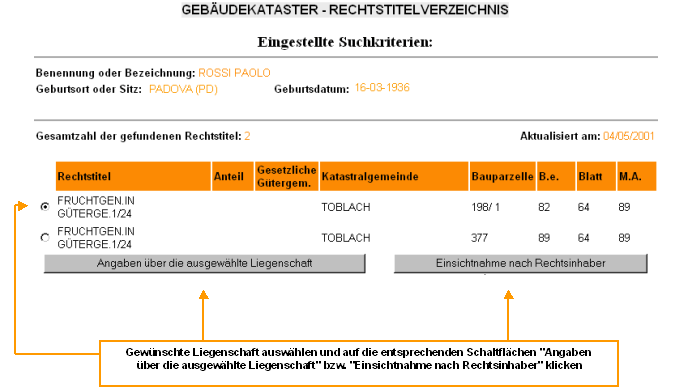 | Rechtstitelverzeichnis Wenn Sie erfahren wollen, auf welche Liegenschaften eine natürliche bzw. juristische Person Rechte beanspruchen kann, gehen Sie folgendermaßen vor: 1. Suche nach natürlicher bzw. juristischer Person vornehmen; 2. Aus diesem Verzeichnis der Rechtsinhaber jenen auswählen, deren Rechtstitel Sie erfahren wollen. Klicken Sie auf die Schaltfläche "Rechtstitel" am Ende des Verzeichnisses. Nun wird das Verzeichnis der Liegenschaften eingeblendet, auf die der Rechtsinhaber Rechte beansprucht. Die Tabelle gibt die Art des Rechtstitels (Eigentum, Fruchtgenuss) und die Daten jeder gefundenen Liegenschaft an. |