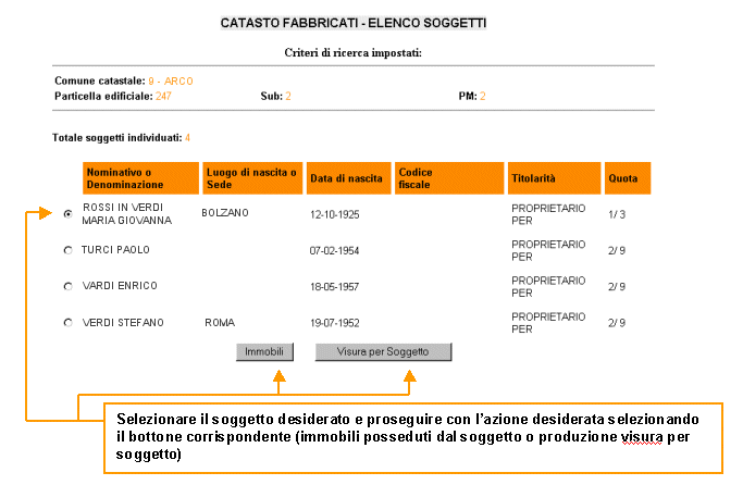 Una volta che viene selezionato uno dei soggetti dalla lista è possibile richiedere la visualizzazione degli immobili intestati al dato soggetto (e quindi continuare con il ciclo) oppure richiedere la Visura o il Certificato per Soggetto. VEDI ANCHE: