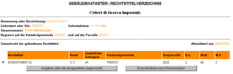 Sie können bei jedem Rechtsinhaber auch auf "Nähere Angaben über die ausgewählte Liegenschaft" oder "Einsichtnahme nach Rechtsinhaber" klicken. SIEHE AUCH: