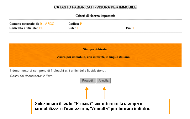 Prima di visualizzare il documento effettivo relativo alla visura richiesta, il servizio ripresenta un riassunto dei dati richiesti e, quindi, riporta il numero di blocchi di cui si compone il documento così reperito. A questo punto l'utente può decidere se proseguire, e quindi pagare la transazione, o se terminare l'operazione. Un esempio di quest'ultima pagina viene riportata nella figura seguente: |